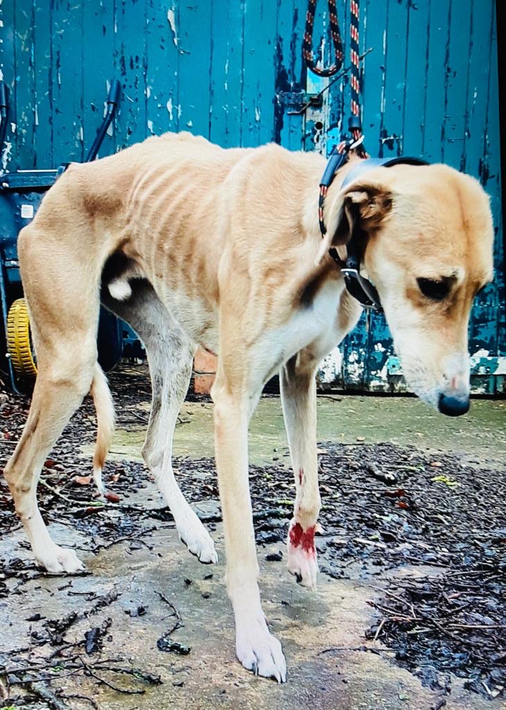 “I threw some food over for it which it ate immediately , and after a while it gained the confidence to come closer to me and I was able to put a lead on it. The poor dog was emaciated and you could see every rib, every bone in its spine and pelvis, and the dog looked like it had given up on life. The dog is now doing well in our care and is putting on much needed weight and will go on to find a new loving home.”